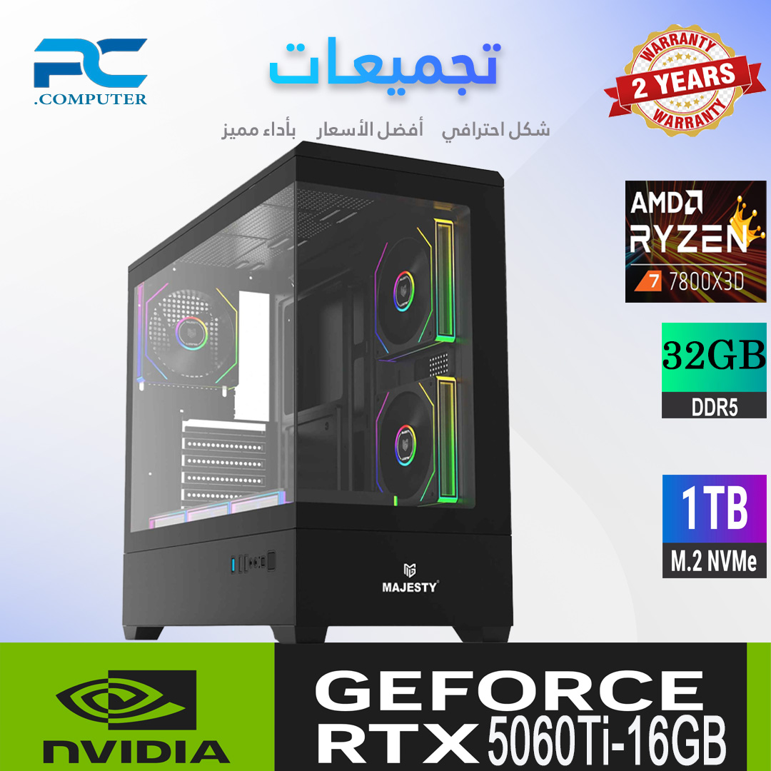 التجميعة تعتمد على معالج Ryzen 7 7800X3D المعروف بأدائه الأسطوري في الألعاب بفضل تقنية 3D V-Cache، مع كارت شاشة RTX 5060 Ti 16GB OC الذي يوفر تجربة سلسة بدقة 1440p و4K مع دعم تقنيات تتبع الأشعة وDLSS.