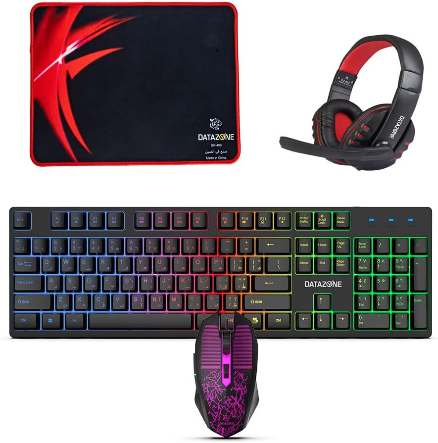 مجموعة متكاملة تشمل لوحة مفاتيح، فأرة، سماعة، ولوحة ماوس، لتجعل تجربة الألعاب أكثر سلاسة واحترافية في جهاز واحد.